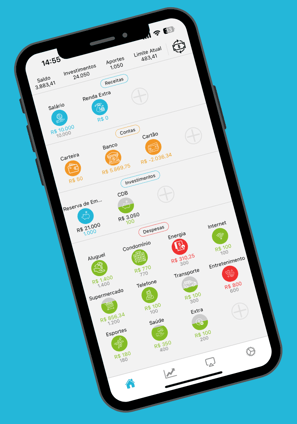 Defina suas categorias de despesas, seus limites e seus objetivos. Monitore visualmente no dia a dia e tenha uma visão clara e intuitiva de seus limites, metas e progresso.